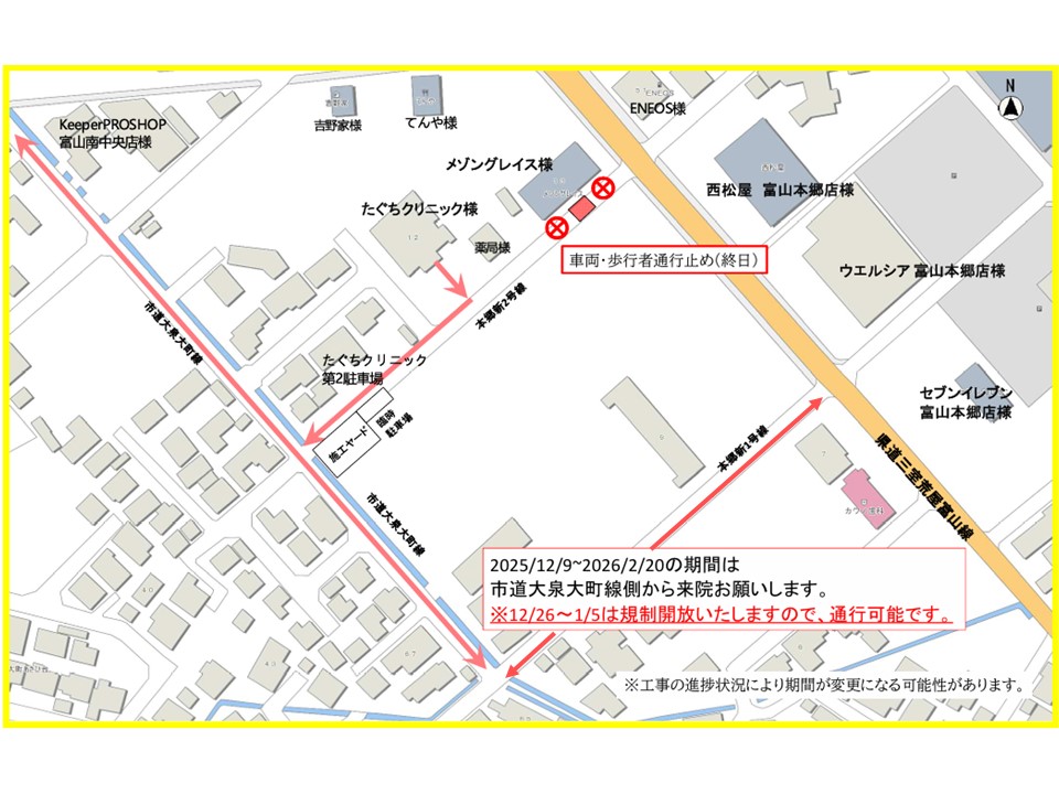 また、通行止め区間は、工事の進捗状況により変更となる場合があります。来院日には当院ホームページにて道路工事の状況を確認いただき、時間に余裕を持ってご来院いただくようお願いいたします。